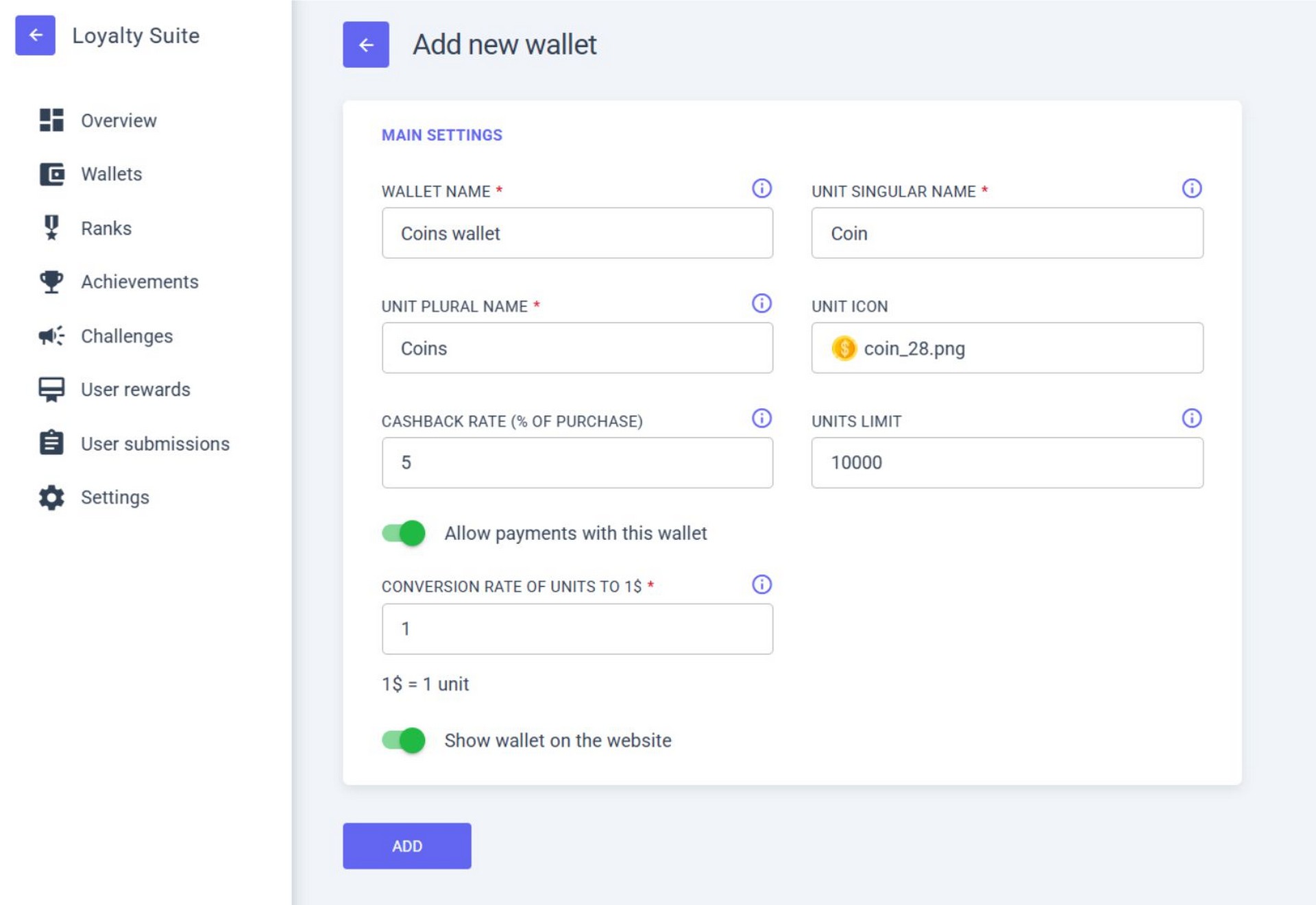 • UNITS LIMIT – set a wallet limit. If left empty, the wallet will have no limits;