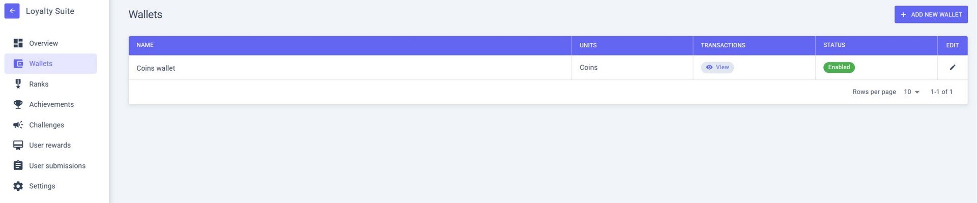 In the WALLETS section you can see the list of all your wallets and their status.