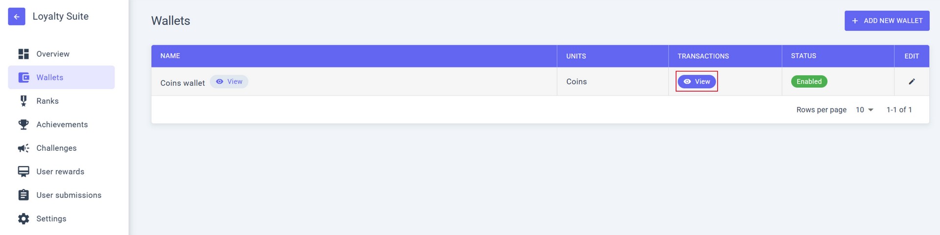To view the list of all transactions of this wallet, click the VIEW button in the TRANSACTIONS column.