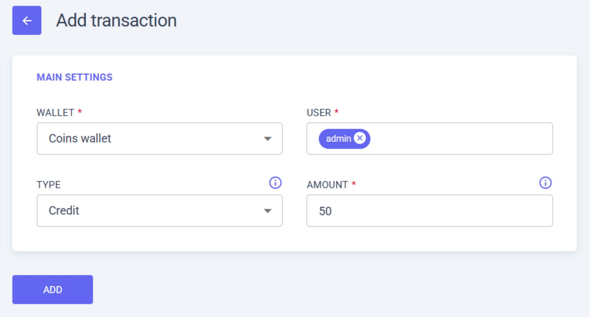 - a. WALLET – select the wallet where the transaction will be made (e.g., “Coins wallet”);
